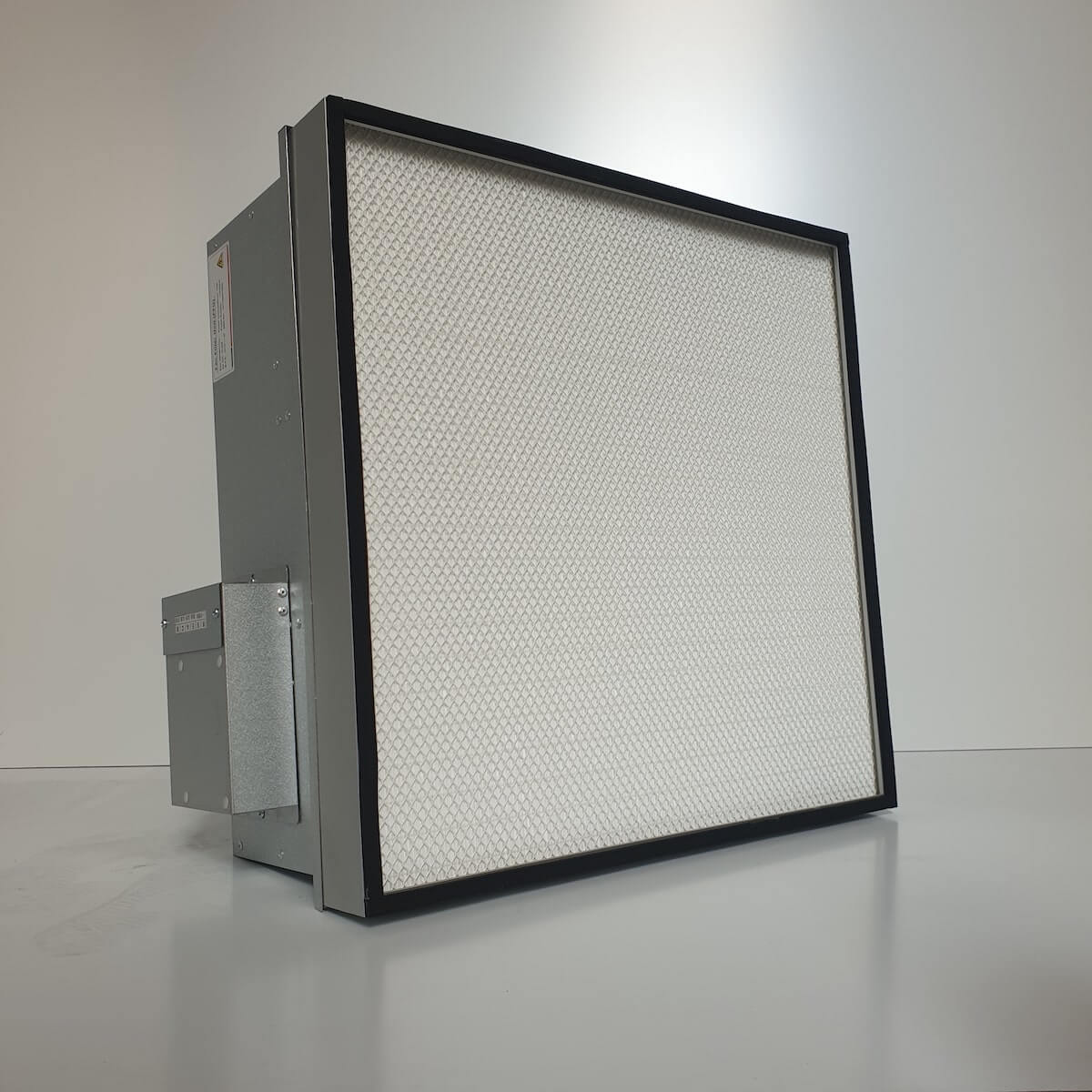 Gabinete autopropulsado diseñado para filtros terminales HEPA sello neopreno o gel. Se puede utilizar en cuartos limpios de diferentes clases.